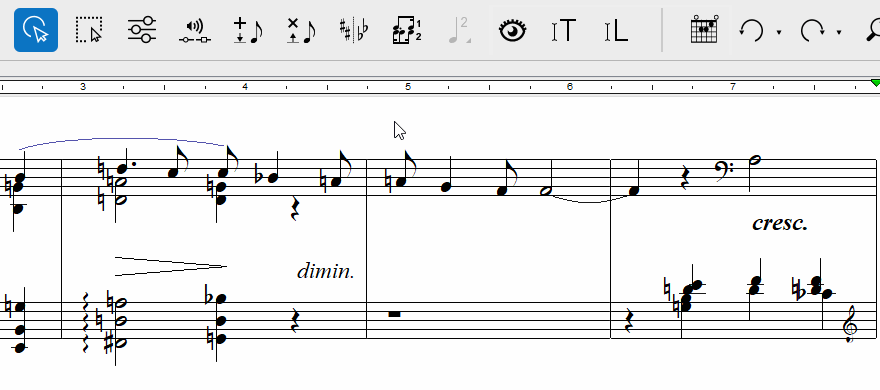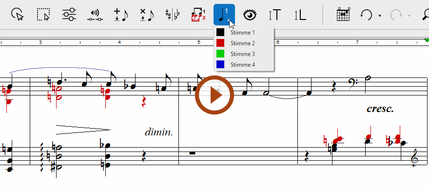 Falls noch nicht geschehen, aktiviere die farbige Anzeige von Stimmen im System, indem du auf die Taste Farbmodus Stimmen klickst. Diese findest du in der Toolleiste Notation sowie in der Tools-Toolleiste.
