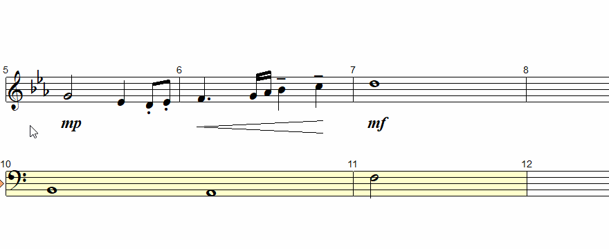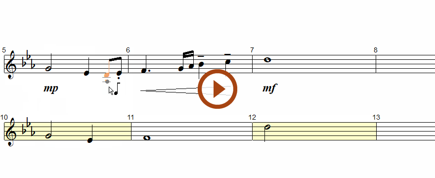 Nun kannst du mit der Bearbei­tung beginnen. Klicke an einer belie­bigen Stelle im Noten­text, um das ange­wählte Notations­element einzu­fügen. Klicke auf ein bereits vorhan­denes Symbol desselben Typs, um es zu ändern (z. B. eine Viertel­note in eine Sechzehntel­note, eine Achtel­pause in eine Viertel­pause, eine ff‑Angabe in eine mf‑Angabe u. s. w.).