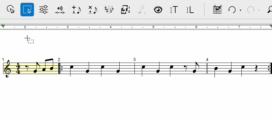 Du kannst die Layout- und auch die Wieder­gabe­eigen­schaften eines jeden Taktes indivi­duell bear­beiten. Aktiviere das Eigenschaften-Tool (ESC-Taste) und klicke auf einen Takt­strich bzw. auf einen Wieder­holungs­anfang.