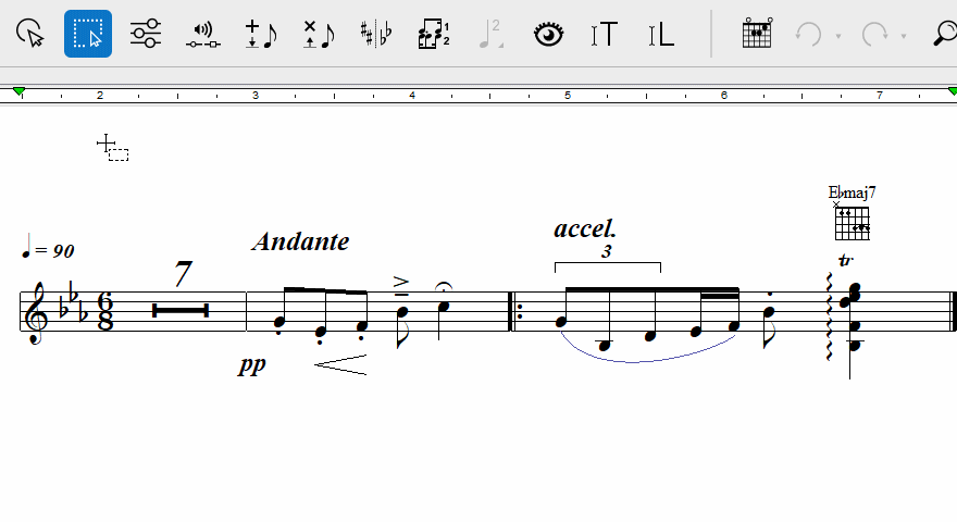Wiedergabe­parameter für nahezu jedes Notations­symbol können einmalig oder dauer­haft mit einem einzigen Klick des Eigen­schaften-Tools bearbeitet werden. Variable Schiebe­regler machen das Ändern von Werten intuitiv. Gefällt dir der Effekt nicht? Stelle einfach die Standard­ein­stellungen wieder her und versuche es erneut.