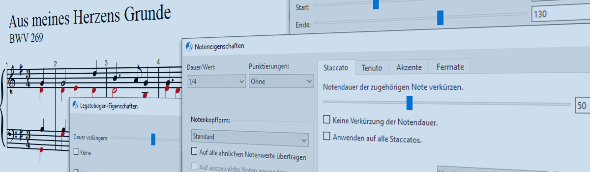 In SmartScore kann nahezu jedes Notationselement und -symbol mit dem Eigenschaften-Tool bearbeitet werden. Zu den bearbeitbaren Einstellungen gehören insbesondere Wiedergabeeigenschaften, aber auch solche, die sich auf die Darstellung von Notationselementen und -symbolen beziehen.