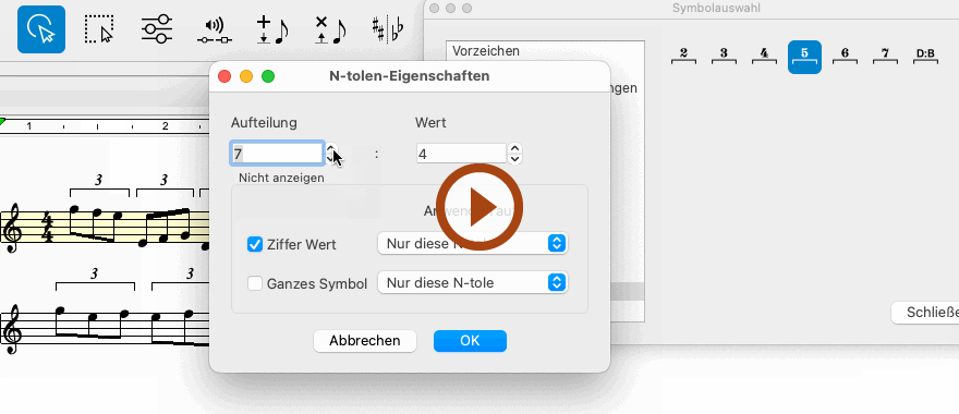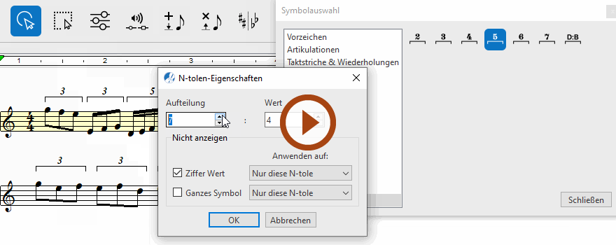 . Du findest es in den Toolleisten Notation, Tools und Wiedergabe. Noch einfacher gelingt der Aufruf des Eigenschaften-Tools mit der ESC-Taste auf der Computertastatur. Klicke dann auf jedes N-tolen-Symbol in deinem Dokument (Ziffer und/oder Klammer), um das Fenster N-tolen-Eigenschaften aufzurufen.