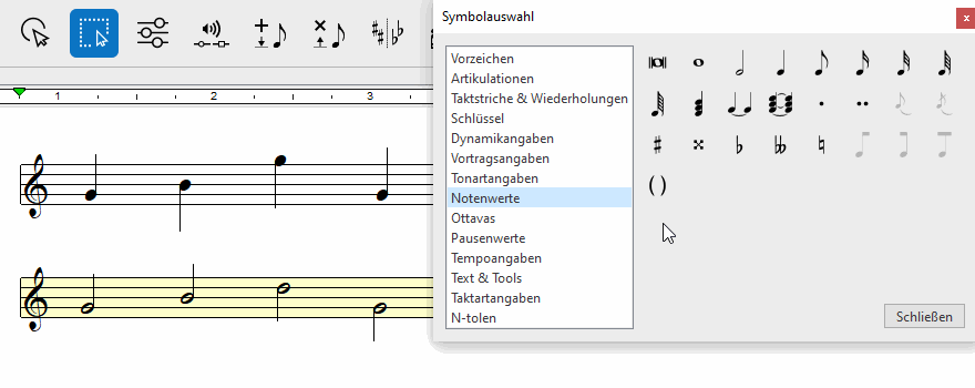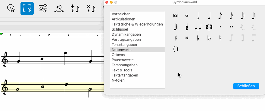Wähle das benötigte Tremolo-Symbol (Einzelnoten-, Doppelnoten-Tremolo) aus der Kategorie Artiku­lationen im Fenster Symbol­auswahl .