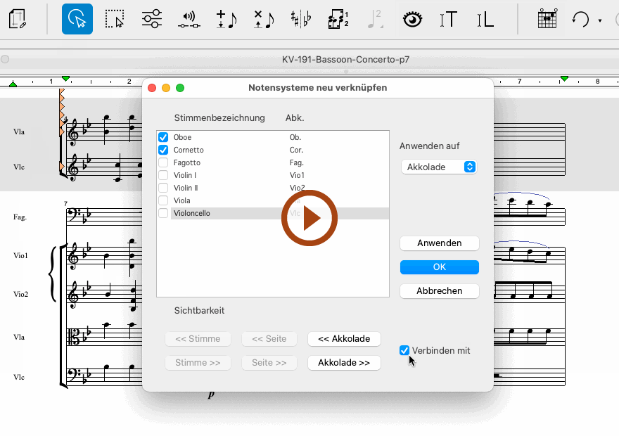 Bitte denke daran, dass du im Fenster Notensysteme neu verknüpfen nie mehr Systeme in der Liste aktivieren kannst, als in der jeweils angezeigten Akkolade tatsächlich auch vorhanden sind.