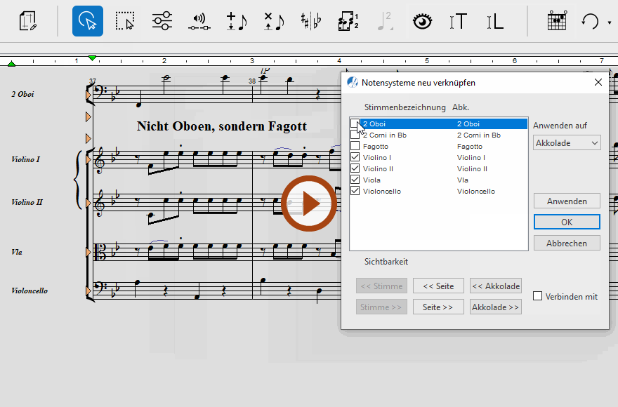 Positioniere den Mauszeiger auf dem Notensystem, das nicht richtig verknüpft ist (falsche Stimmenbezeichnung, falscher Instrumentenklang). Drücke dann