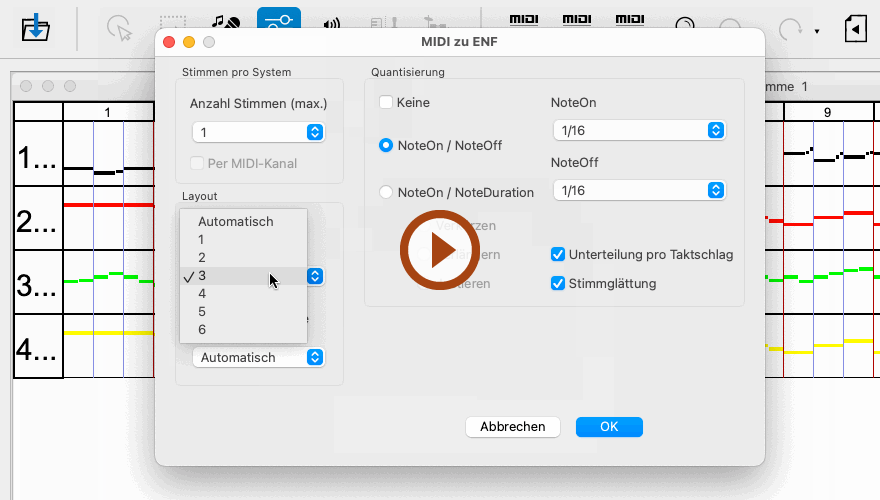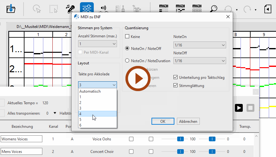 Die Berechnung von polyphonen Strukturen gehört eigentlich nicht zum klassischen MIDI-Repertoire. Das Extrahieren von mehr als zwei polyphonen Stimmen im Rahmen einer MIDI-zu-ENF-Konvertierung führt oftmals zu wenig brauchbaren Notenergebnissen. Aber du kannst es versuchen. Sollte es nicht klappen, reduziere die Anzahl der Stimmen pro System im Fenster MIDI zu ENF.