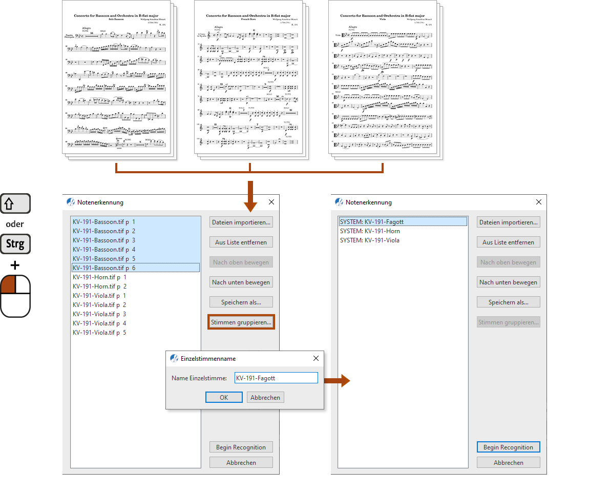 In SmartScore kannst du noch vor der eigentlichen Erkennung eine beliebige Anzahl an Einzelstimmendokumenten zu sogenannten Stimmengruppen zusammenfassen. Nach der Notenerkennung erscheinen die Erkennungsergebnisse zwar nach wie vor in Form separater SmartScore-Dokumente, bei der Wiedergabe erklingen jedoch alle Stimmen gleichzeitig.