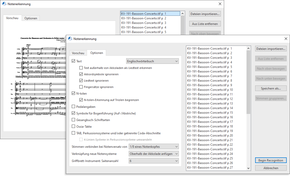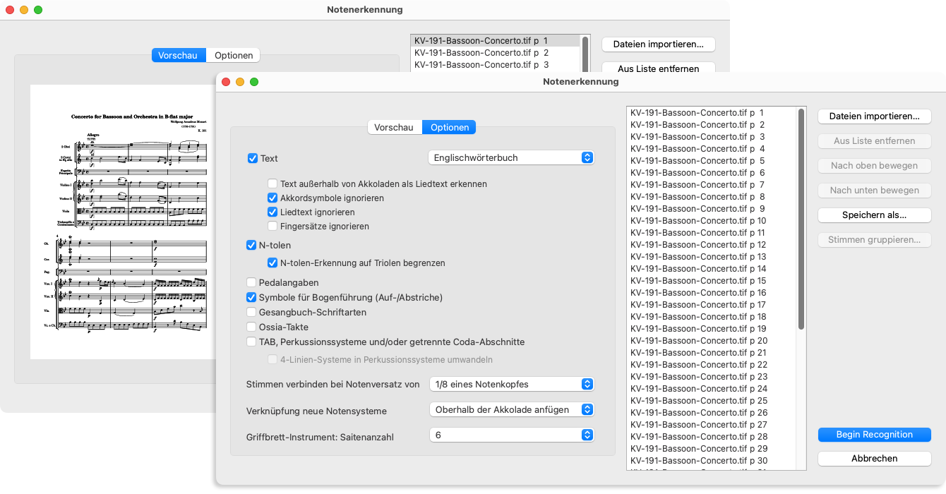 Optionen: Die zahlreichen Erkennungs­optionen erlauben es dir, Einfluss auf die Noten­erkennung zu nehmen. Siehe auch: Erkennungs­optionen