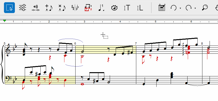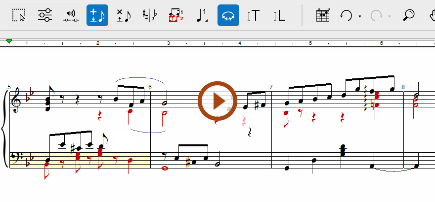 Gib deine Noten, Pausen und alle sonstigen Notationselemente und Symbole wie gewohnt in den Notentex ein. Beachte, dass die eingegebenen Symbole leicht transparent eingefügt werden. Das zeigt dir, dass der