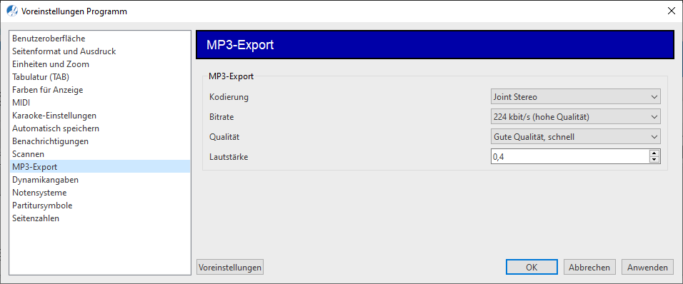 Übrigens: Die MP3-Exporteinstellungen (Kodierung, Bitrate, Qualität, Lautstärke) kannst du unter >MP3‑Export individuell anpassen: