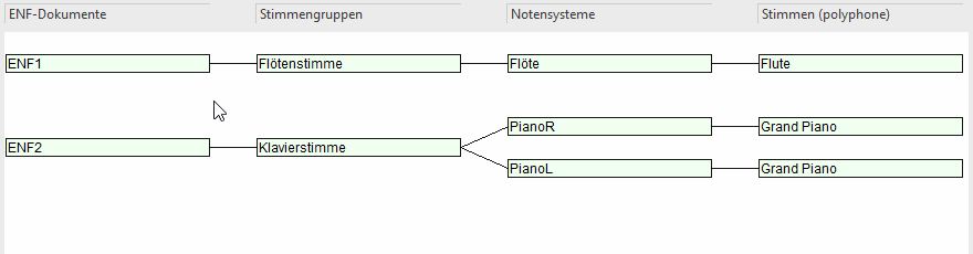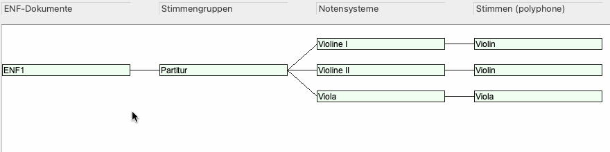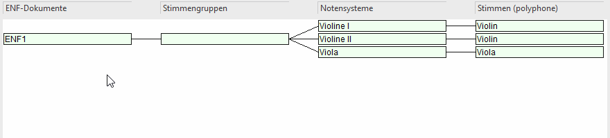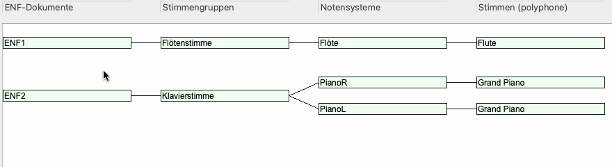 Stimmengruppen sind quasi mehrere ENF-Dokumente innerhalb einer ENF-Datei. Sie können genutzt werden, um z. B. Instr­umenten­gruppen (Holz, Blech, Streicher, etc.) separat zu notieren. Wird die Gesamt­datei abge­spielt, erklingen alle Stimmen­gruppen zusammen.