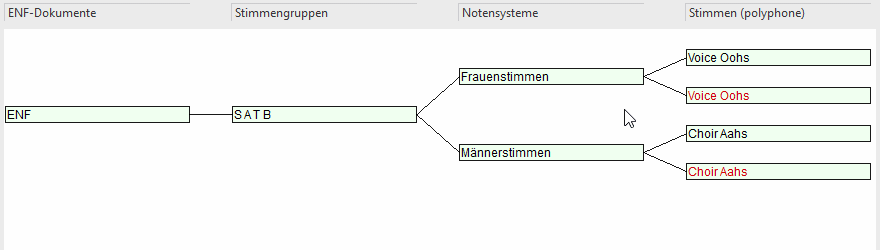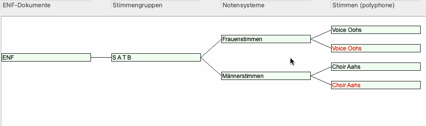 Die im Partiturmanager dargestellten Elemente ("Bausteine") stehen jeweils in einer Beziehung zu einem über­geord­neten Element. So gehören in dieser "Kind-Eltern-Beziehung" poly­phone Stimmen zu einem Noten­system, Noten­systeme zu einer Stimmen­gruppe bzw. zur Partitur, dem eigent­lichen ENF-Dokument. Diese Beziehungen (oder "Abhängig­keiten") werden im Partitur­manager durch Verbin­dungs­linien zwischen den einzelnen Elementen kennt­lich gemacht.
