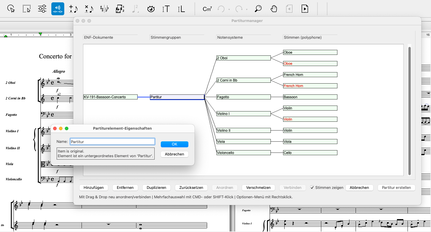 Bei allen Bearbeitungen, die du im Partitur­manager durch­führst, steht am Ende immer ein neues Dokument (Taste "Partitur erstellen"). Das Original-ENF-Dokument bleibt also stets unver­ändert.