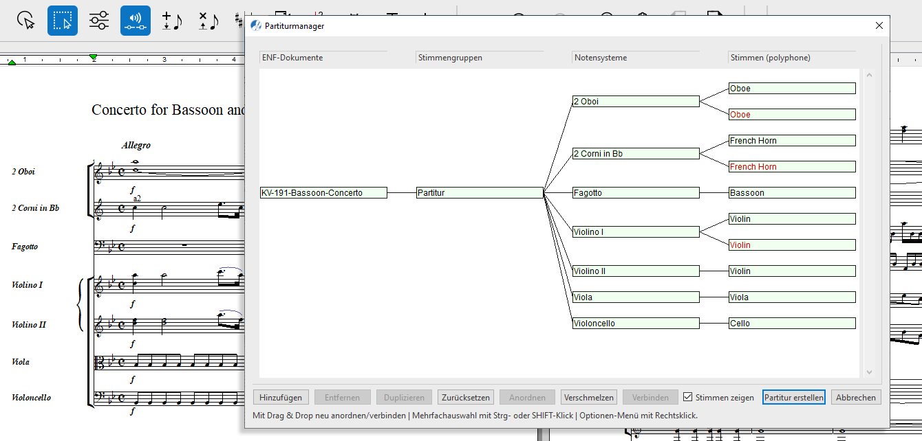 Mit der Taste Partitur erstellen wird ein neues ENF-Dokument auf Basis dessen, was im Partitur­manager ange­zeigt wird, erstellt.
