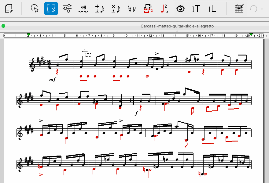 Jedes Notensystem einer in SmartScore erkannten Noten­vorlage, die in Standard­notation notiert ist, kann in ein Tabulatur­system umge­wandelt werden. Umgekehrt geht das aber auch. Neben verfüg­baren Standard-TAB-Systemen für Instru­mente mit vier, fünf oder sechs Saiten kannst du auch dein komplett eigenes TAB-System defi­nieren und als Vorlage speichern.