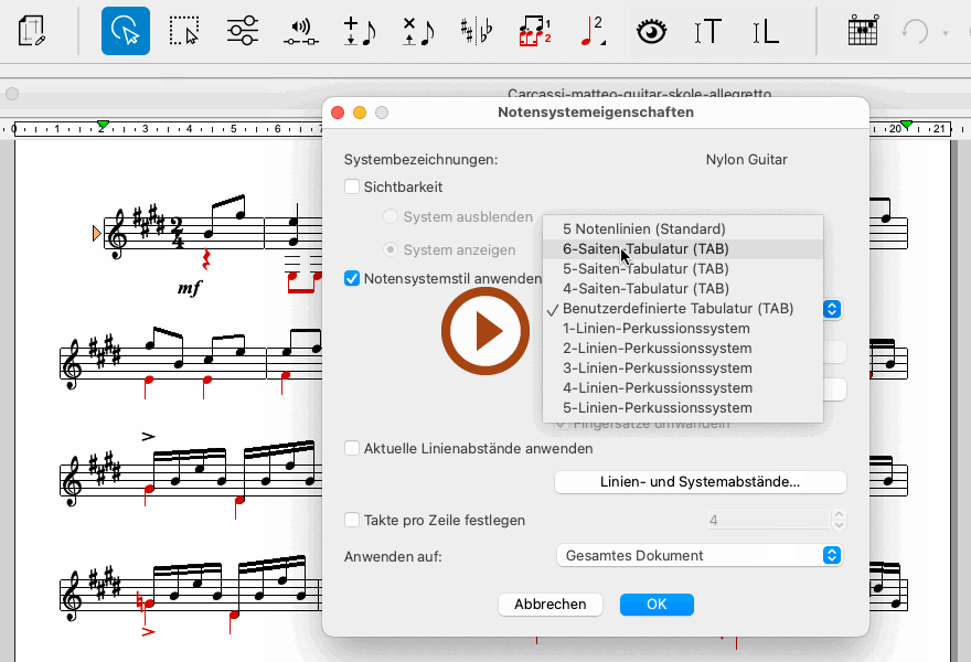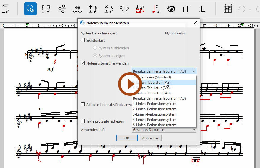 Klicke im Fenster Notensystem­eigen­schaften auf OK, um die Konver­tierung des TAB-Systems zu starten.