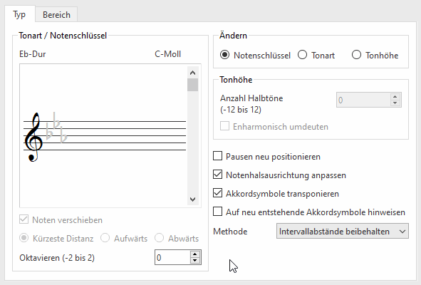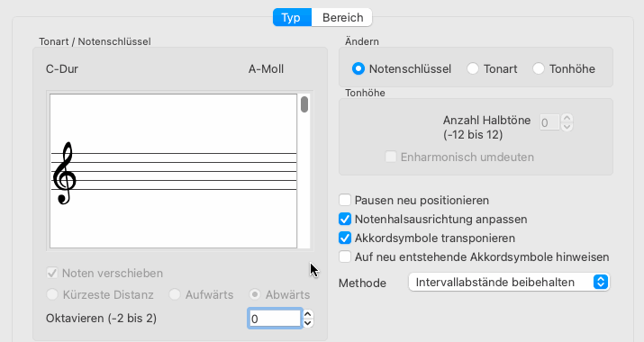 Um die Schlüssel-Transposition zu begrenzen (Noten­system, Stimme, Takt- oder angewählter Bereich), wechselst du im Transponieren-Fenster oben in den Tab Bereich.