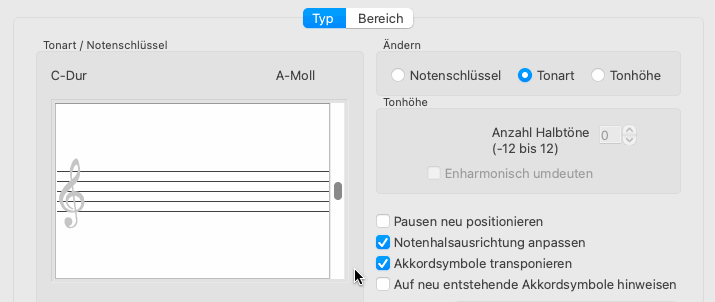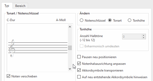 Möchtest du die Tonart-Transposition auf einen bestimmten Taktbereich, ein Notensystem oder eine polyphone Stimme begrenzen, wechselst du im