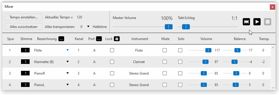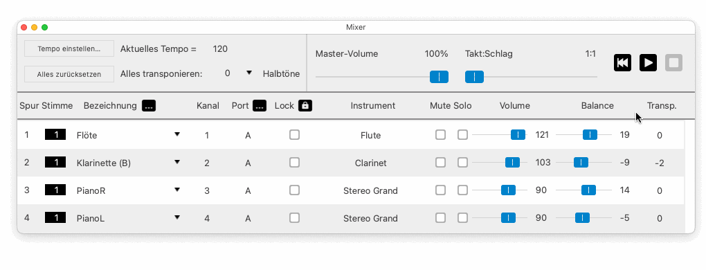 Im SmartScore-Mixer kannst du jedem MIDI-Instrument ein Transpositionsintervall zuweisen und damit die Wiedergabe dieses Instruments anpassen.