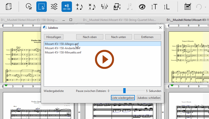 In der Jukebox von SmartScore kannst du beliebig viele ENF-Dateien laden und diese zu einer Playlist zusammenstellen. Die geladenen Dateien werden dann nacheinander abgespielt. Du kannst sogar festlegen, wie lange die Pause zwischen den einzelnen Wiedergabedateien der Playlist sein soll.