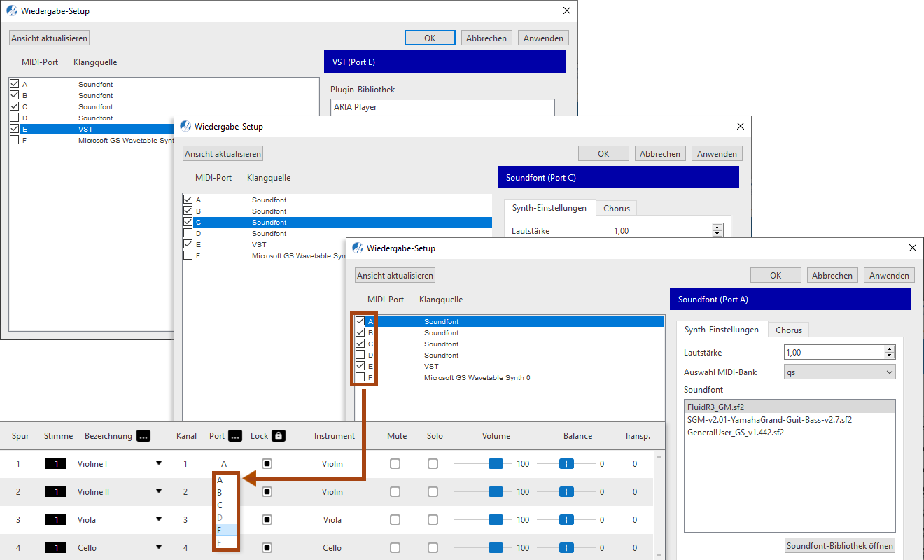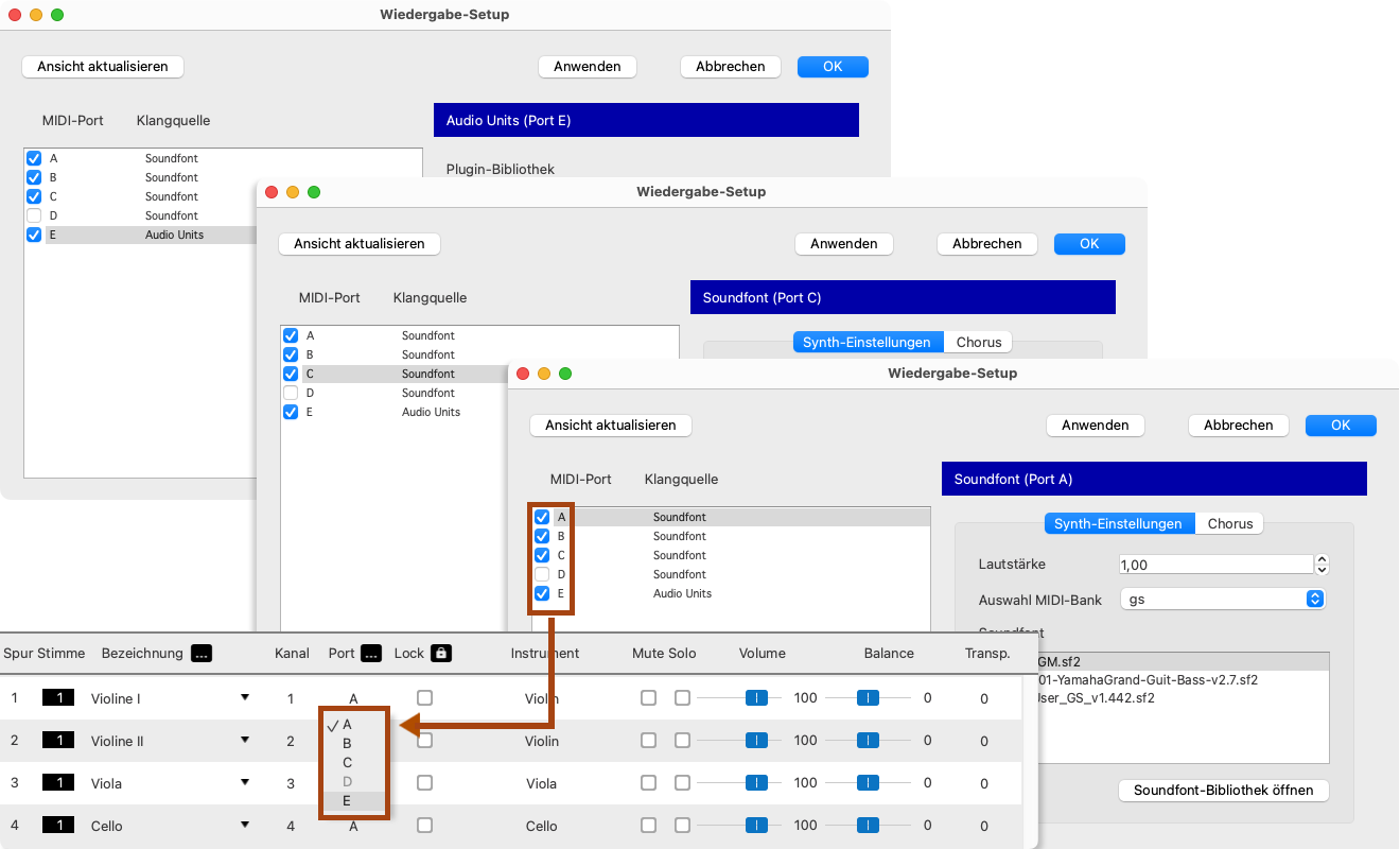 eine Stimme einen anderen Port-Buchstaben auswählst, dann wird dieses Instrument/diese Stimme mit der Klangquelle wiedergegeben, die im Fenster Wiedergabe-Setup mit dem ausgewählten Buchstaben (MIDI-Port) verknüpft ist.