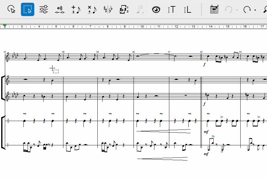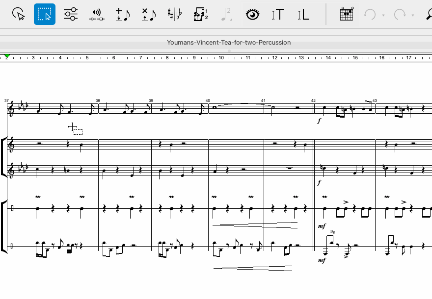 Jedes in Standardnotation geschriebene Notensystem kann mit der Funktion Notensystemeigenschaften in ein Perkussionssystem mit einer variablen Anzahl an Notenlinien (1 bis 5) konvertiert werden. Das geht aber auch anders herum. Die verschiedenen Tonhöhen des Standardnotensystems können dann mithilfe der Perkussionstabelle unterschiedlichen Schlagzeug- und Percussion-Instrumenten zugeordnet werden.
