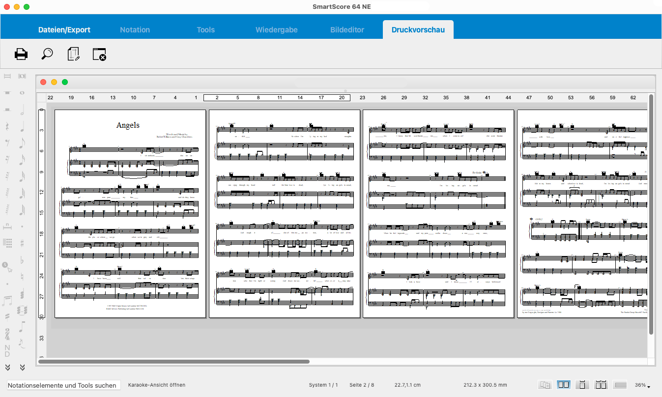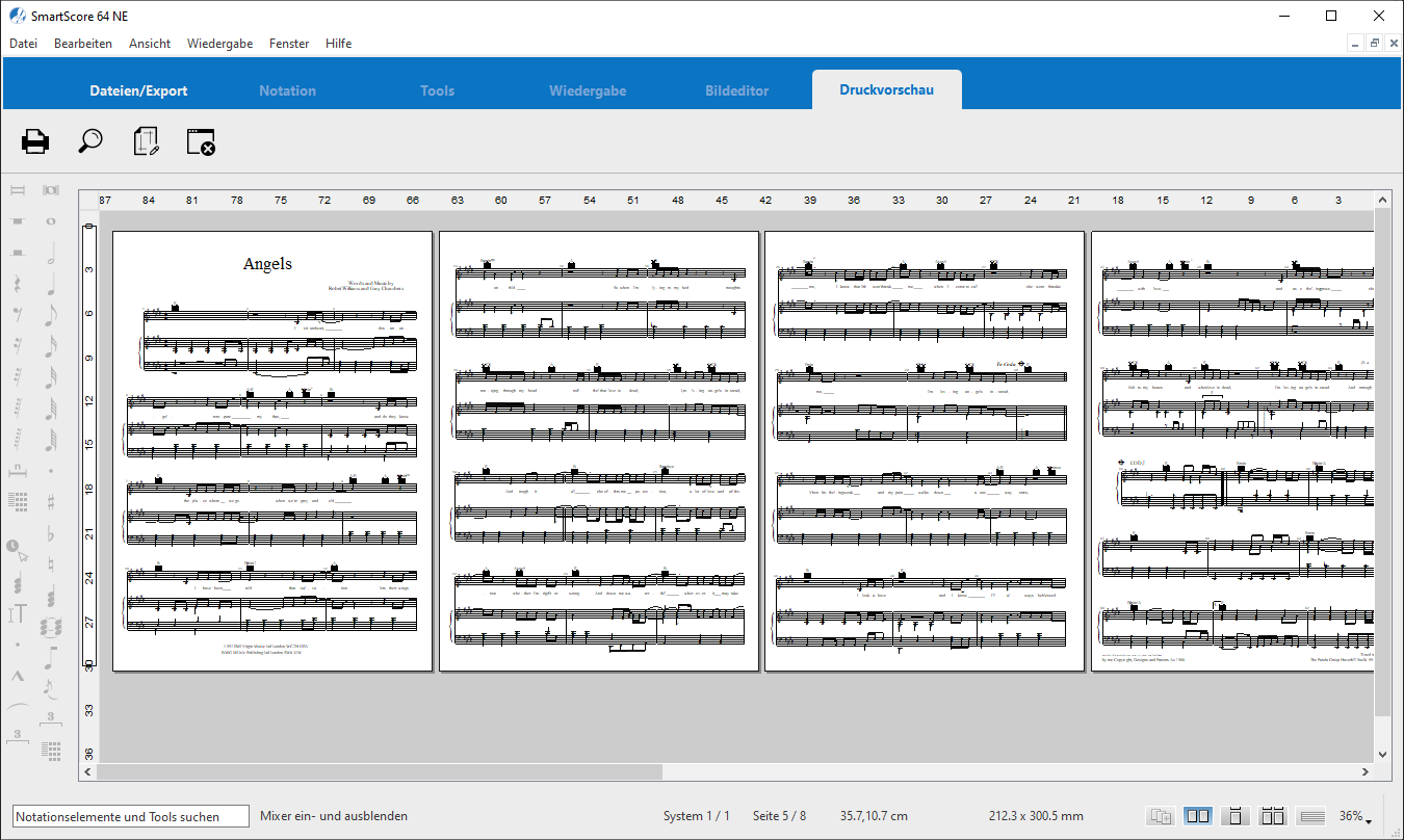 In der Druckvorschau-Ansicht kannst du dir deine Notenseiten noch einmal anschauen, bevor du sie ausdruckst oder als PDF-Datei exportierst. Damit hast du eine abschließende Kontrollmöglichkeit über das fertige Seiten- und Dokumentlayout.