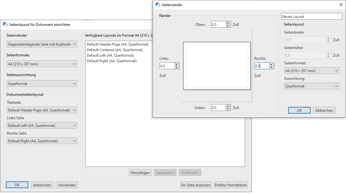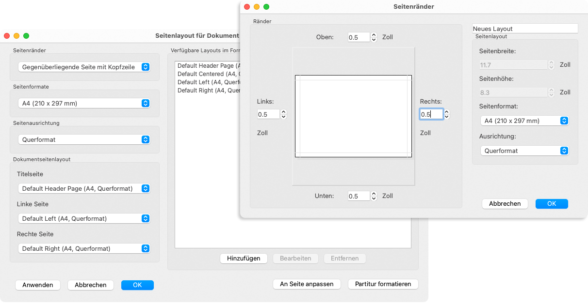 Hinzufügen klicken und ein eigenes Layout mit Seitengröße, Ausrichtung und Seitenrändern sowie einer eigenen Bezeichnung für das Layout zusammenstellen. Dieses eigene Layout wird dann in der jeweiligen Kategorie benutzerdefinierter Layouts dauerhaft gespeichert, so dass du es immer wieder nutzen kannst.