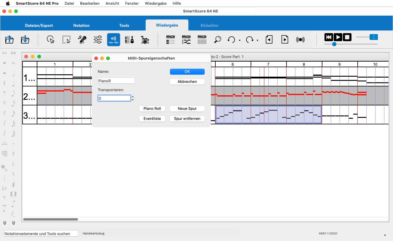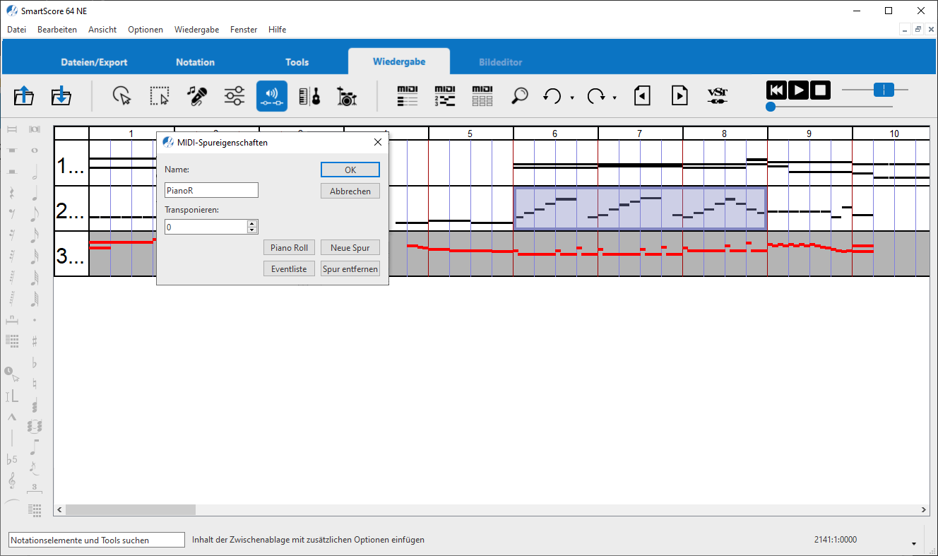 Ein Klick mit der linken Maus­taste markiert die komplette Spur. Ein Doppel­klick auf eine Spur­nummer öffnet diese Spur in der MIDI-Piano-Roll-Ansicht.