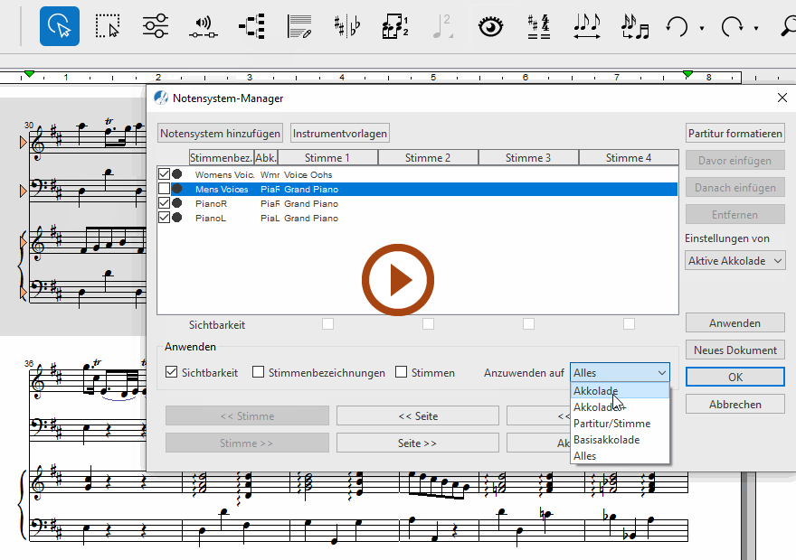 In der Auswahlliste Anwenden auf weiter rechts wählst du nun den Bereich der Partitur aus, auf den sich das Ausblenden des Systems auswirken soll: